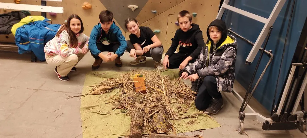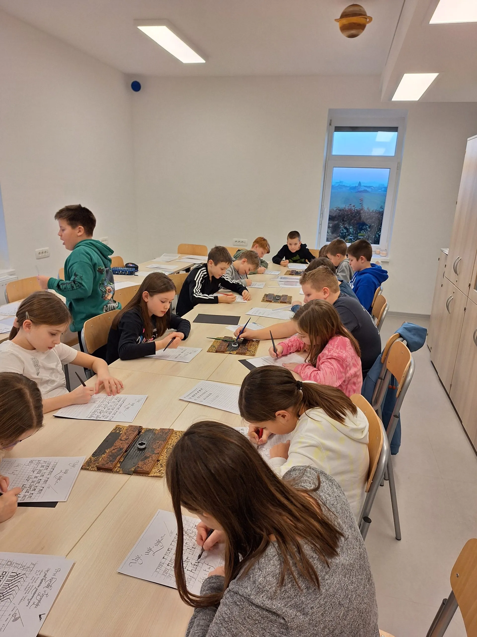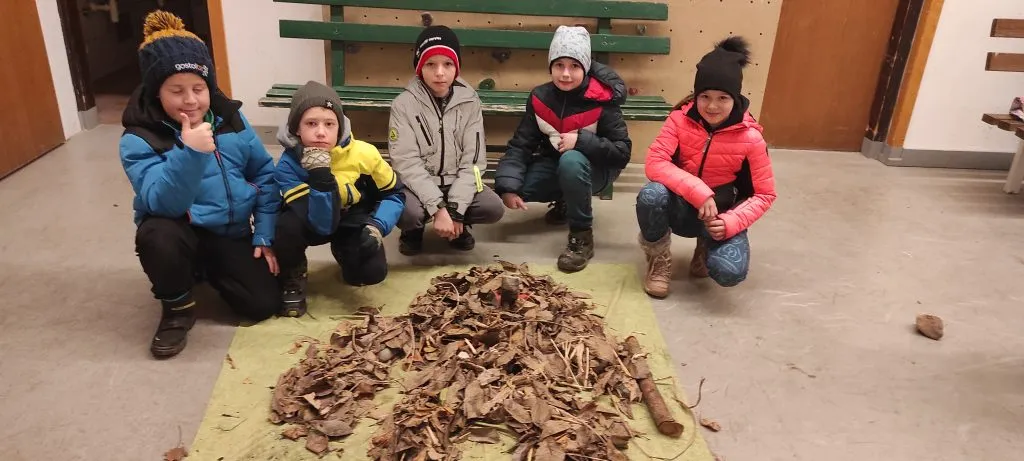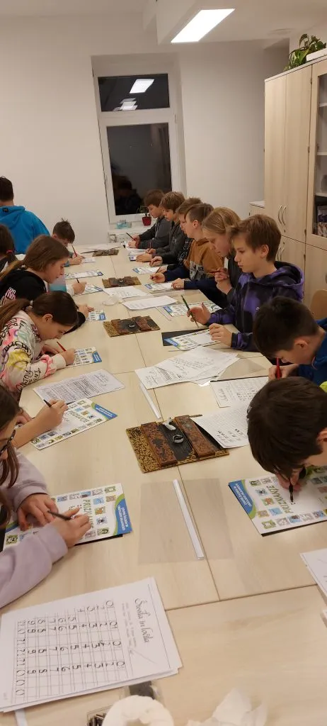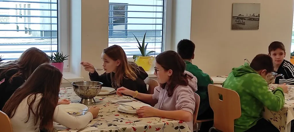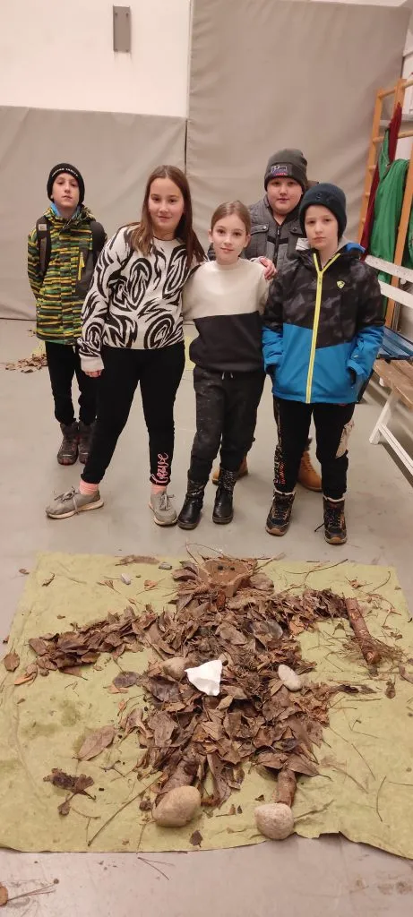 Po kosilu je bila slaba ura prostega časa. »Končno,« je bilo slišati. Popoldne so petošolci spoznali kurentovo opravo in ga izdelali iz naravnih materialov, ki so jih nabrali v okolici doma. Šestošolci so se spopadli s kaligrafijo in v pisavi italica napisali priznanje. Trenutno je spet nekaj časa »za po svoje« in čakamo večerjo. Bo carsko, na jedilniku je carski praženec.