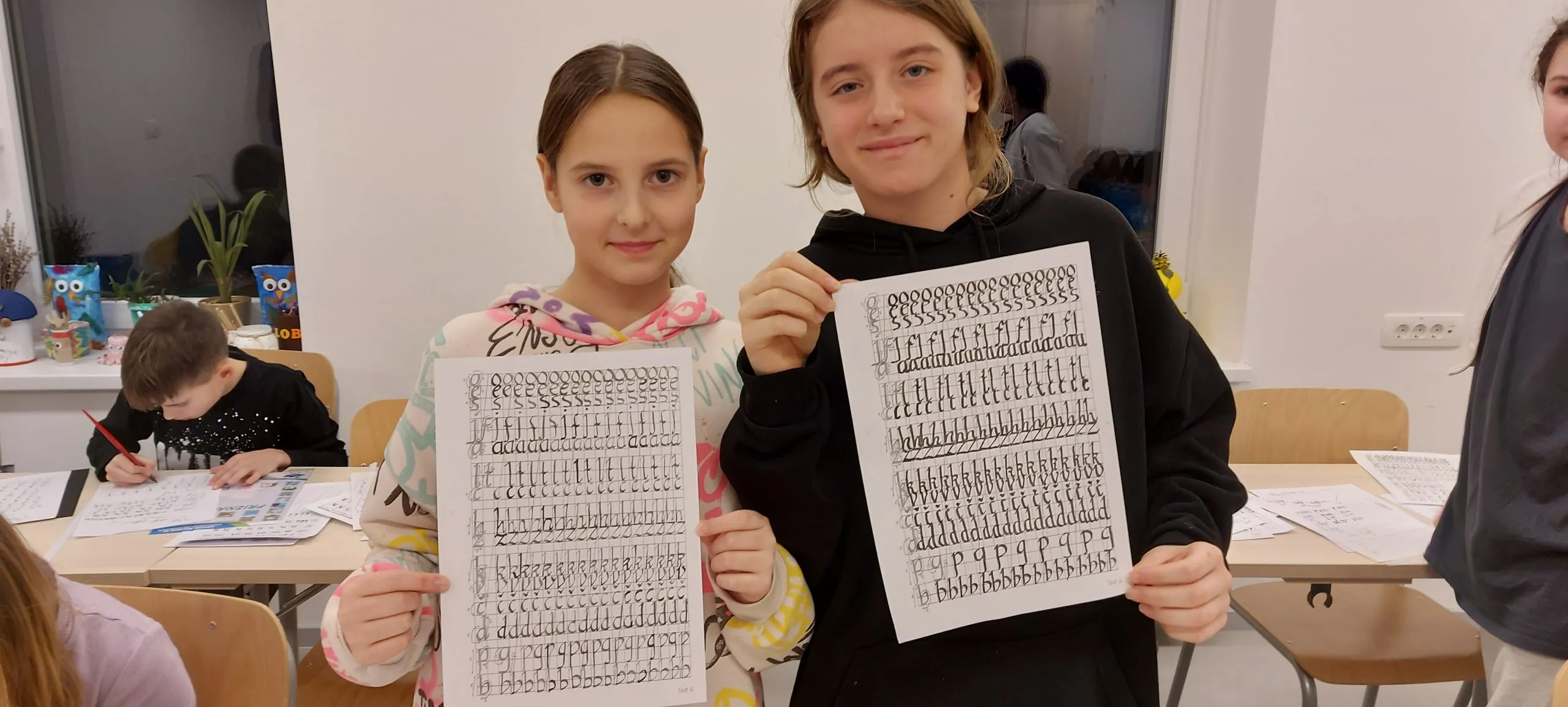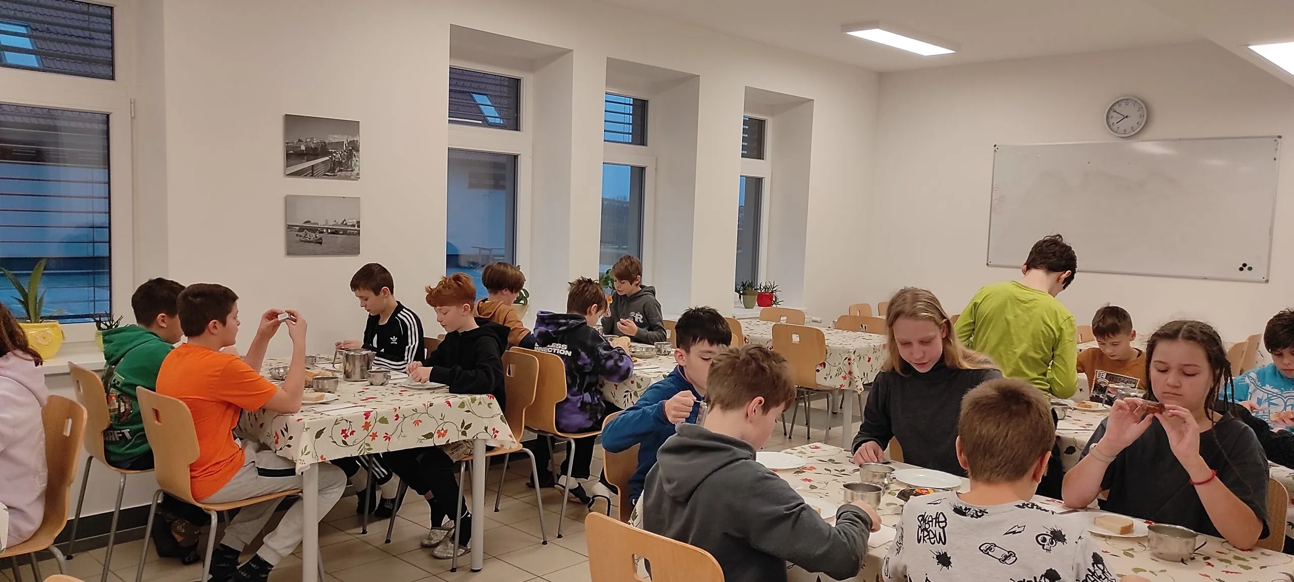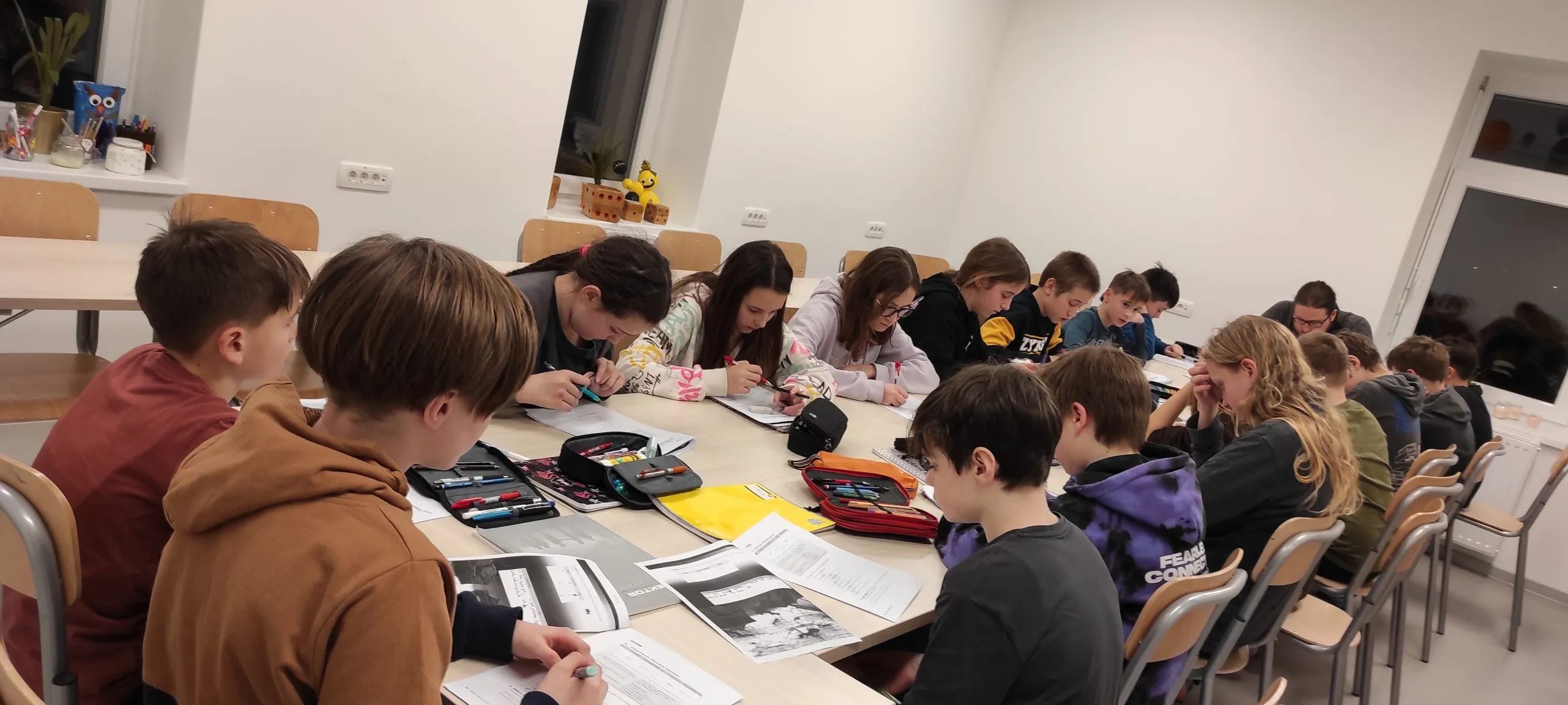Po kosilu je bila slaba ura prostega časa. »Končno,« je bilo slišati. Popoldne so petošolci spoznali kurentovo opravo in ga izdelali iz naravnih materialov, ki so jih nabrali v okolici doma. Šestošolci so se spopadli s kaligrafijo in v pisavi italica napisali priznanje. Trenutno je spet nekaj časa »za po svoje« in čakamo večerjo. Bo carsko, na jedilniku je carski praženec.