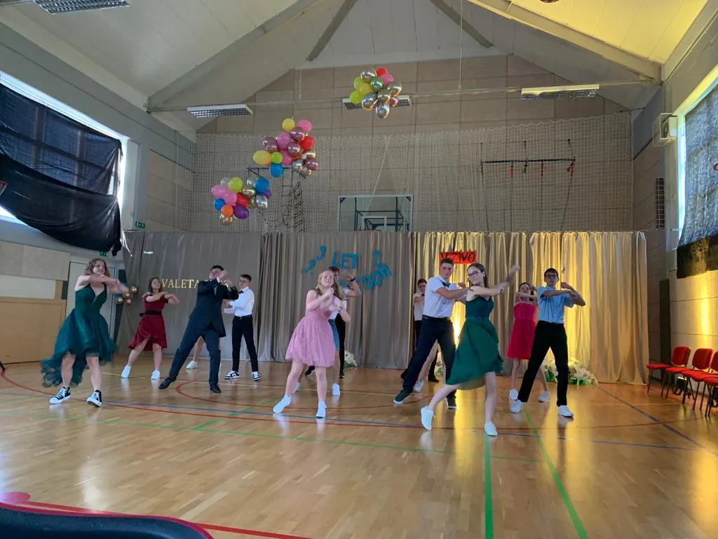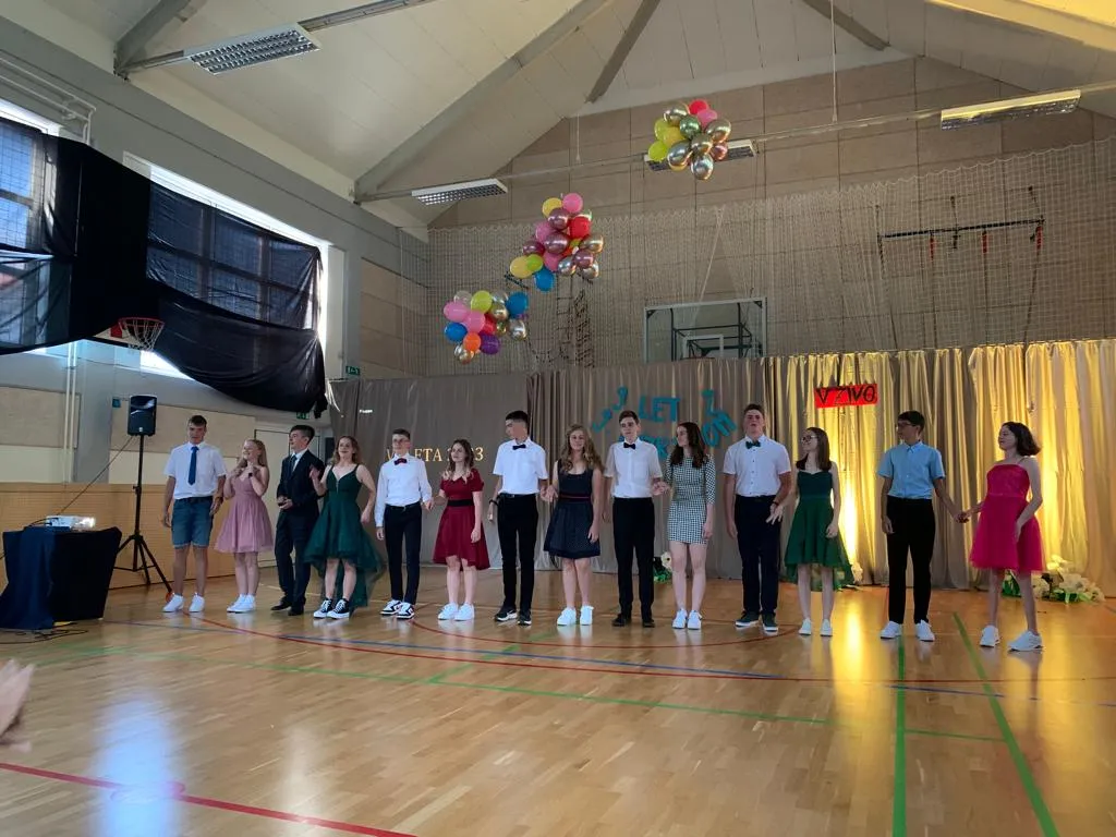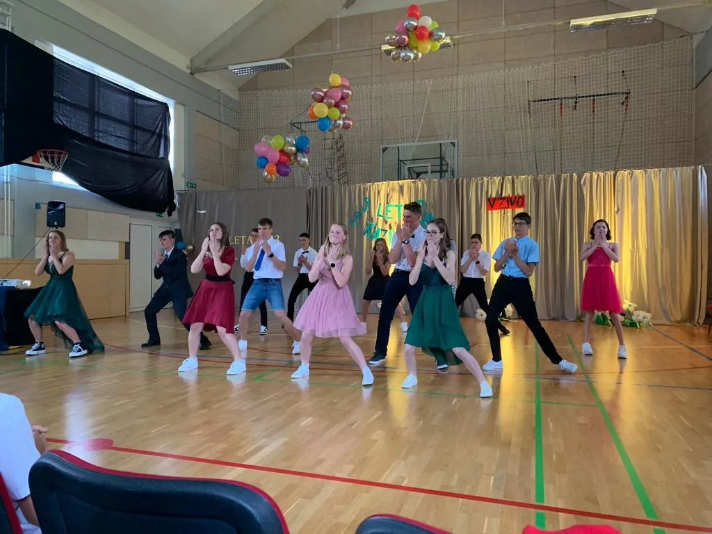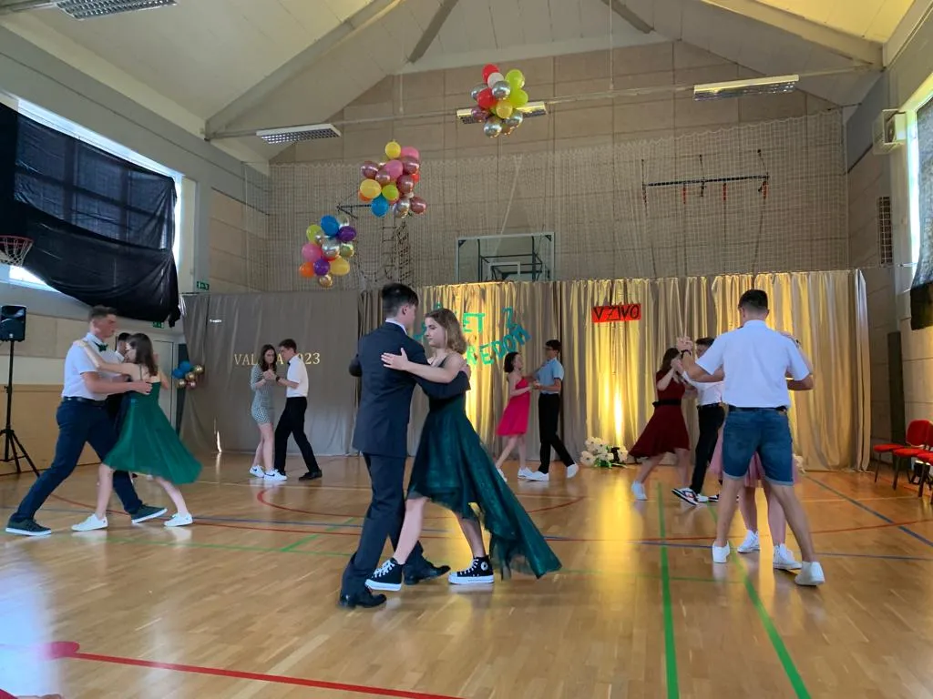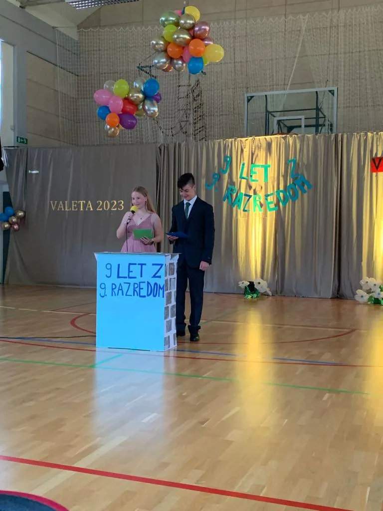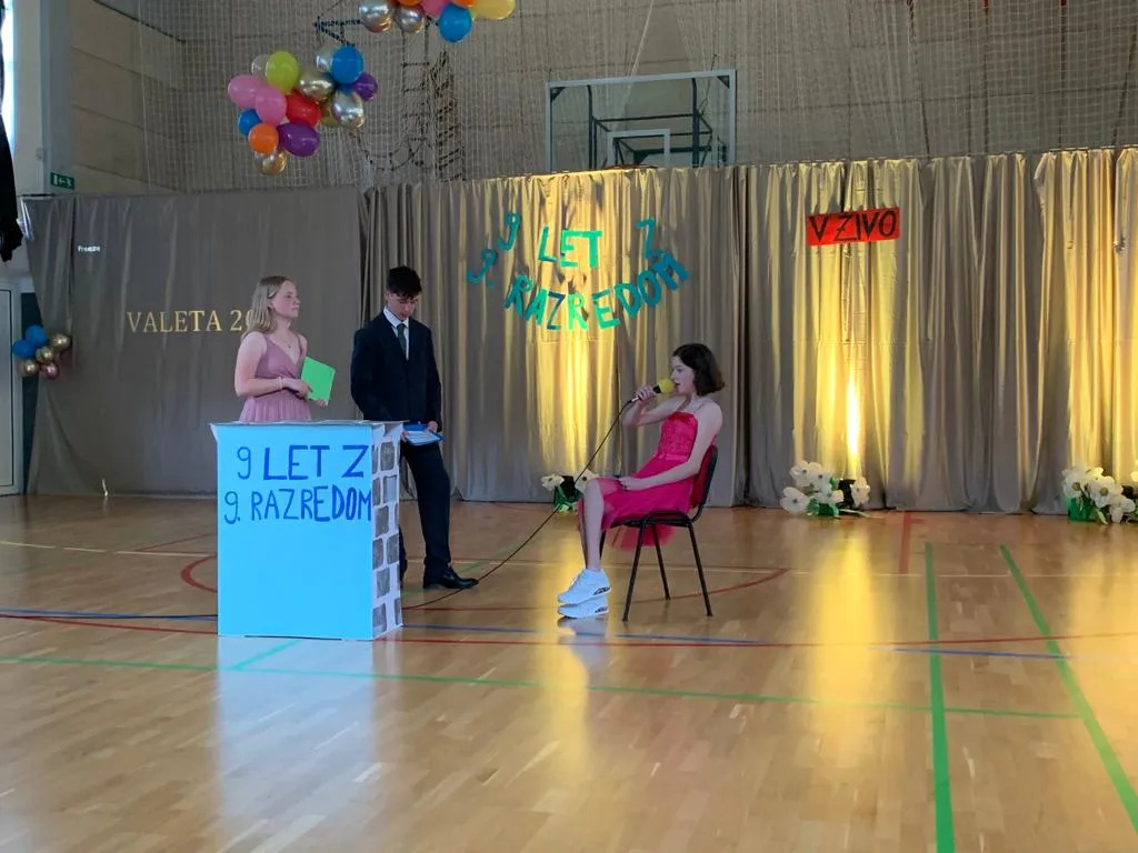V sredo, 14. 6. 2023, je sledila valeta. Brez da bi razkrili preveč kaj se je dogajalo v zakulisju, bomo povedali le to, da je dan potekal pestro v pripravah na večerno prireditev. Težko je ubesediti občutke, ko so izza vrat devetošolci gledali publiko in smo se skupaj z njimi tresli od treme – čisto po nepotrebnem, saj so učenci in učenke izvedli program brez težav in poželi aplavze za ples, recitacijo, in vse vmes. Še enkrat se resnično zahvaljujemo vsem, ki ste se prireditve udeležili.