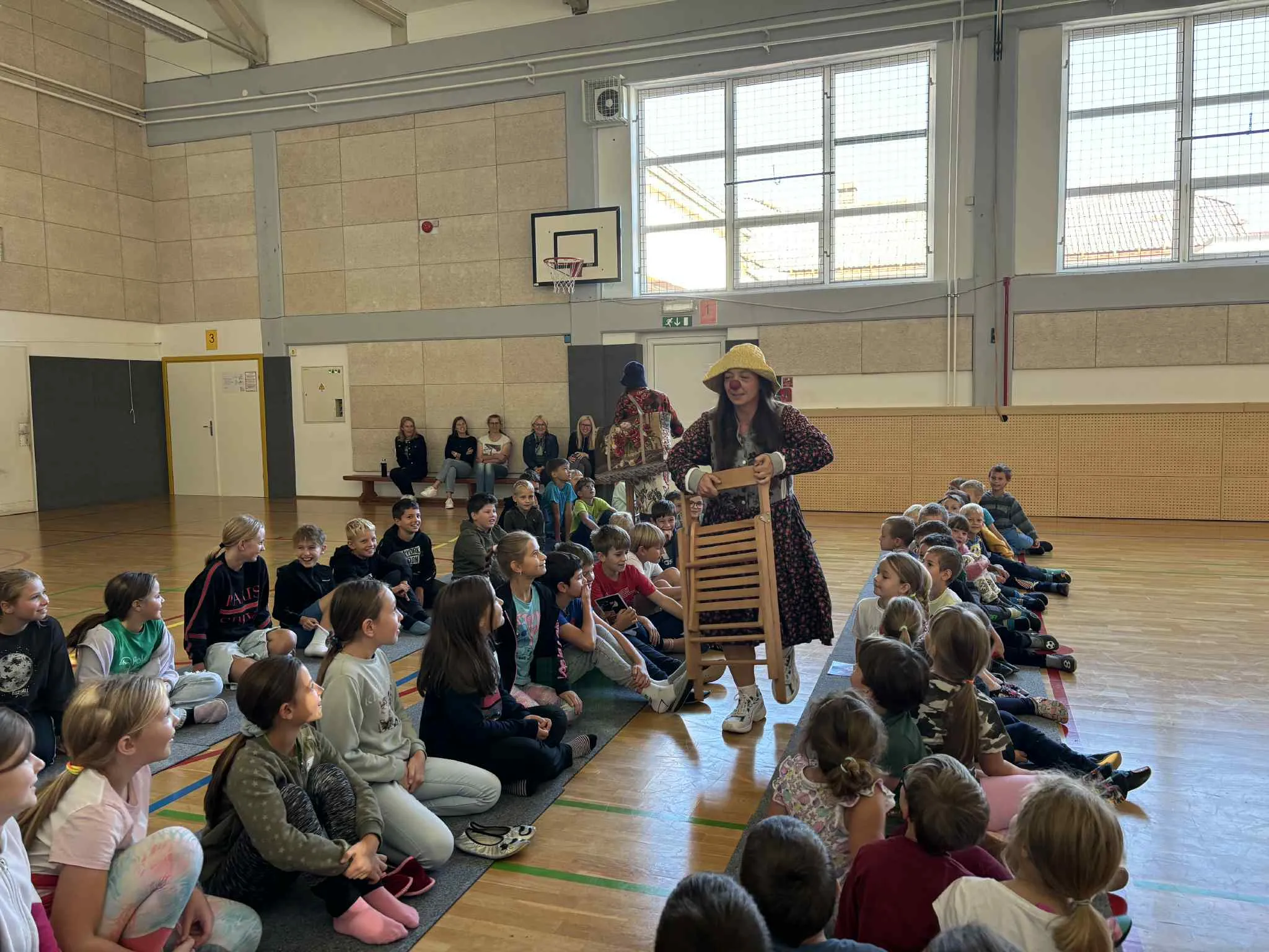 Kar naenkrat sta v telovadnico prišli še dve gospe – prav tako na ogled predstave. Vse sta lepo pozdravili, nas vprašali kako smo in se usedli pred otroke. In smo skupaj čakali na začetek predstave.