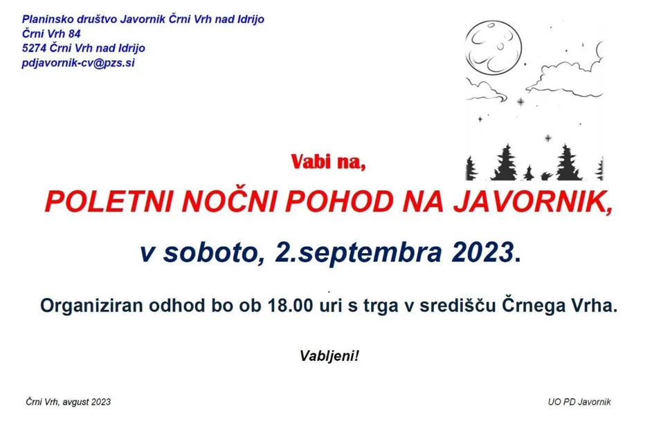 V soboto, 2.9. 2023, planinsko društvo Javornik Črni Vrh vabi na poletni nočni pohod na Javornik.