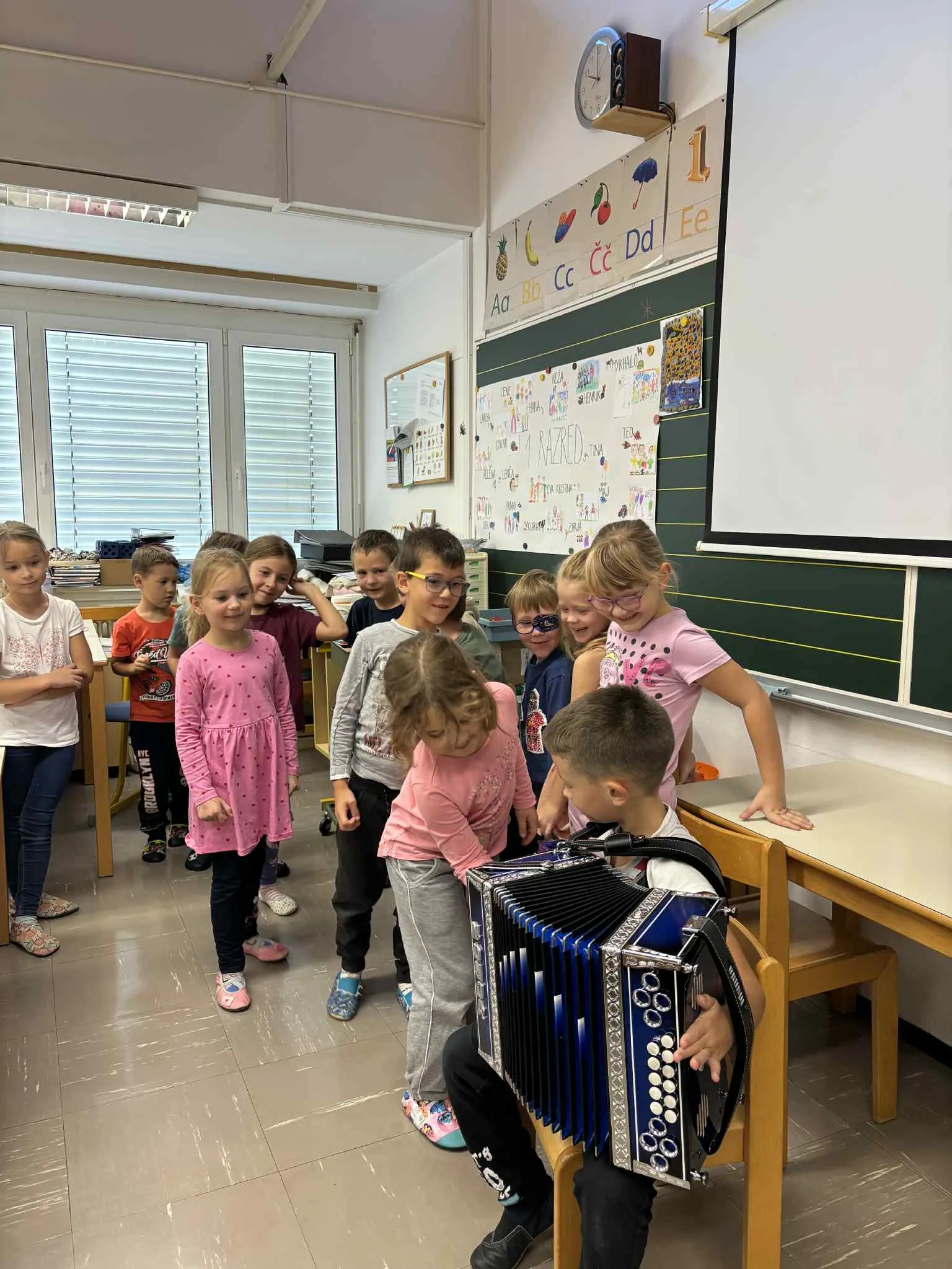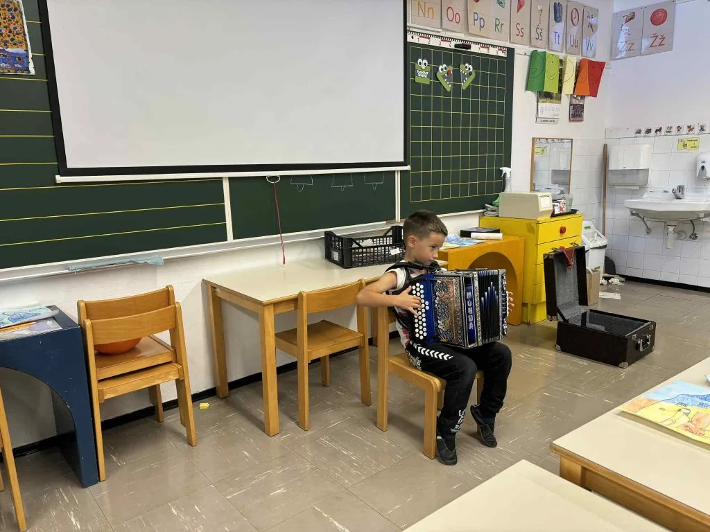 V prvem razredu smo eno izmed ur glasbene umetnosti preživeli na malo drugačen način. Naš prvošolec Maj je v šolo prinesel svojo harmoniko in nam jo ponosno predstavil.