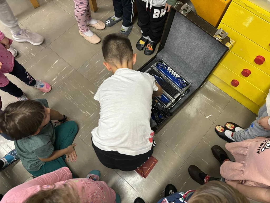 Najprej nam je zaigral dve pesmi, ki se ju je naučil pri uri harmonike. Vsi smo mu z veseljem prisluhnili ter ga nagradili z aplavzom. Nato je Maj sošolcem razložil, kako harmonika deluje, iz česa je sestavljena in zakaj je potrebno z njo ravnati previdno.