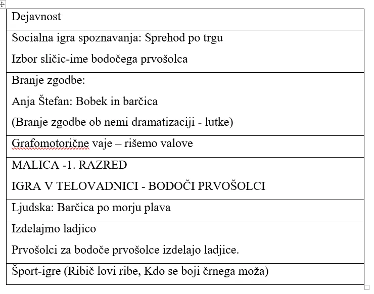 Dan je potekal sproščeno in igrivo. Otroci so naredili polno barčic in se čisto zares igrali. Peli so pesem Barčica po morju plava, opazovali vrstnike, učiteljice in šolo. Prepričani smo, da so že mislili na morje in počitnice pa tudi na šolo, ki jih z veseljem pričakuje čez dobre tri mesece. Bodoči prvošolci so se za nekaj časa poslovili in odšli novim dogodivščinam naproti.